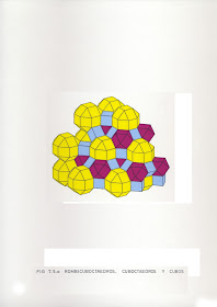 Como para muestra basta un botón, aquí tenemos un conglomerado espacial que incluye cubos (4,4,4), cuboctaedros (3,4,3,4) y rombicuboctaedros (3,4,4,4). Cada cubo está en contacto con cuatro rombicuboctaedros y dos cuboctaedros, el cuboctaedro confina con seis cubos y ocho rombicuboctaedros, los cuales a su vez están en contacto con doce cubos, ocho cuboctaedros y seis poliedros de su misma clase: